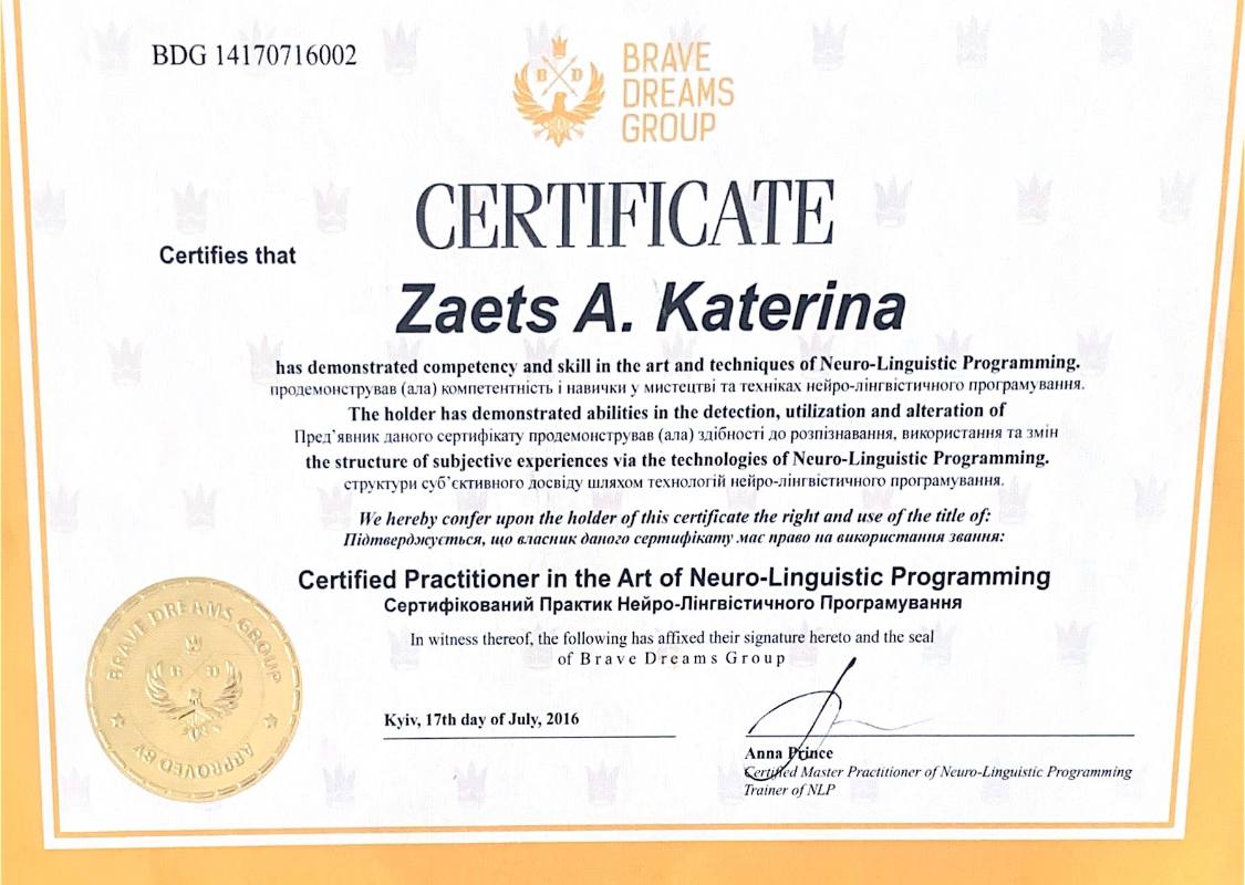 У 2015-2016 році пройшла курс та отримала звання сертифікованого практика нейро-лінгвістичного програмування.