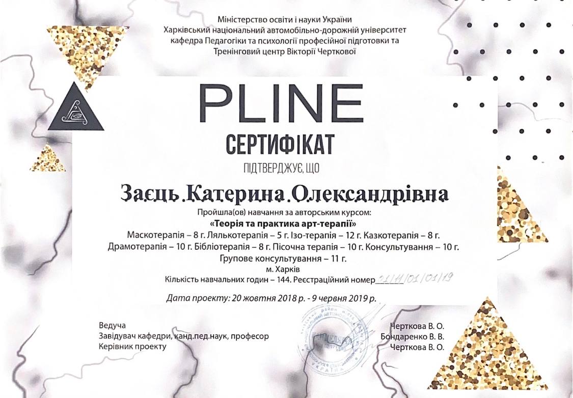 Пройшла навчання за авторським курсом "Теорія і практика арт-терапії" у освітньому тренінговому центрі Pline Вікторії Черкової.