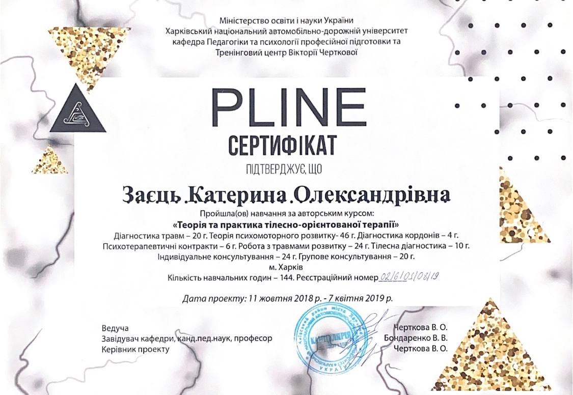 У 2019 році парарельно з навчанням у магістратурі я навчаюся у центрі Pline напрямку тілесно-оріентовної терапії.