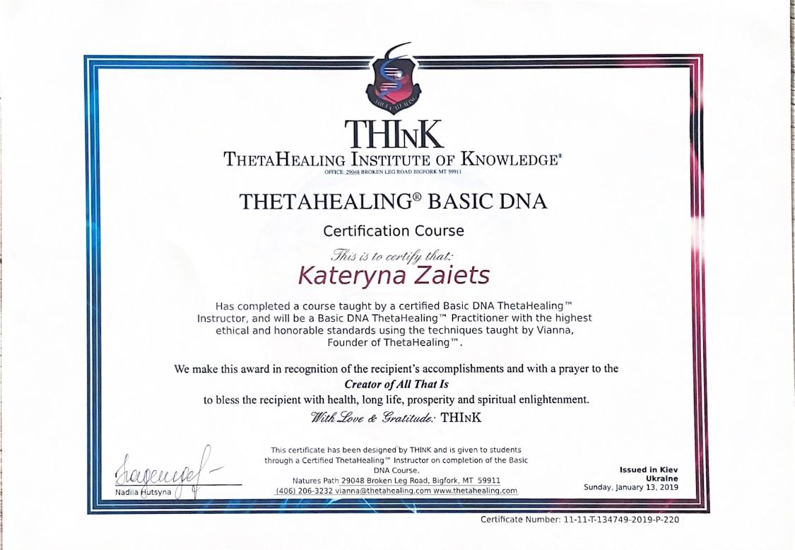 У січні 2019 року навчалася Thetahealing Basic DNA. Отримала навички та звання практика Тета-хілінгу.