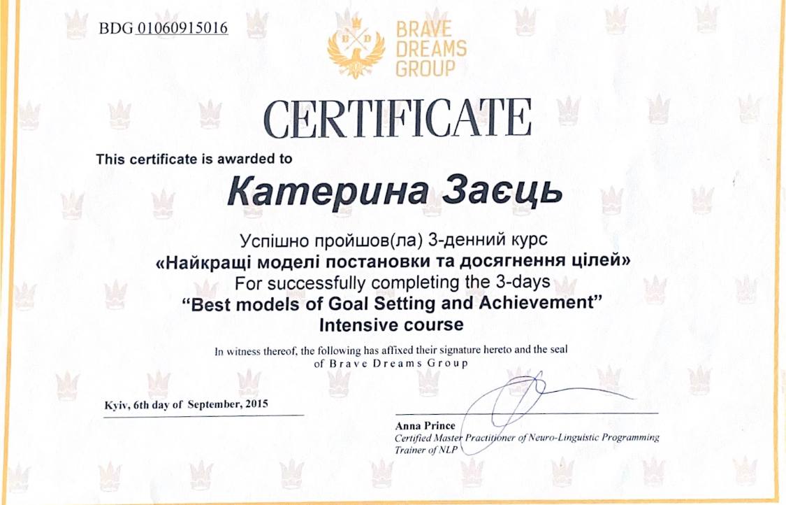 У 2015 р. почала свій шлях зі знайомства з НЛП та пройшла курс "Найкращи моделі постановки та досягнення цілей".