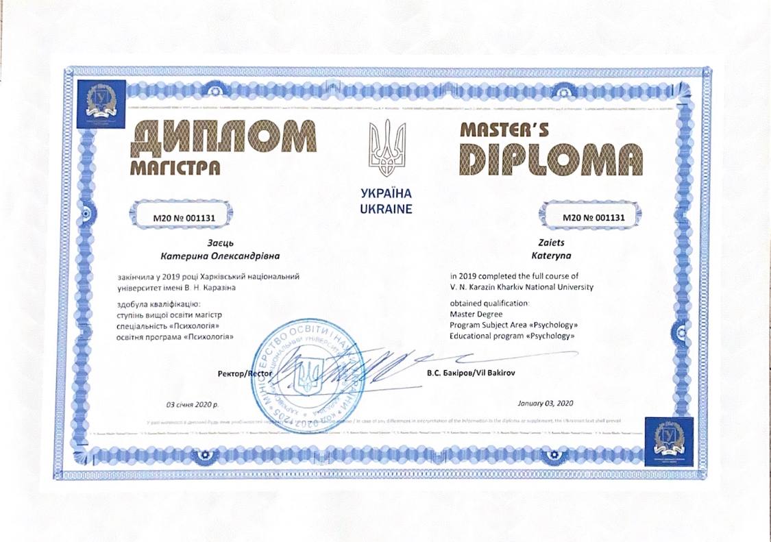 У 2019 році я закінчила ХНУ ім.В.Н.Каразіна, факультет психології, де отримала ступінь магістр.